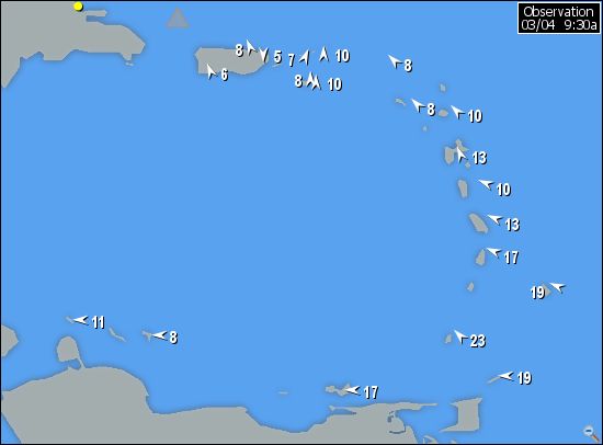 Well, true, one could get skunked anywhere, but Barbados is actually pretty far from Aruba and Aruba does seem to get the most consistent wind. Check the map, although this morning's not a good example as Aruba, all the way lower left is reading 11 and barbados, all the way lower right is reading 19. Seems to often be the otherway around... in looking at the wind archives for April 09, Aruba seems to show better, but my luck would have it when I go, I would probably get one day of 11m kiting in a week...