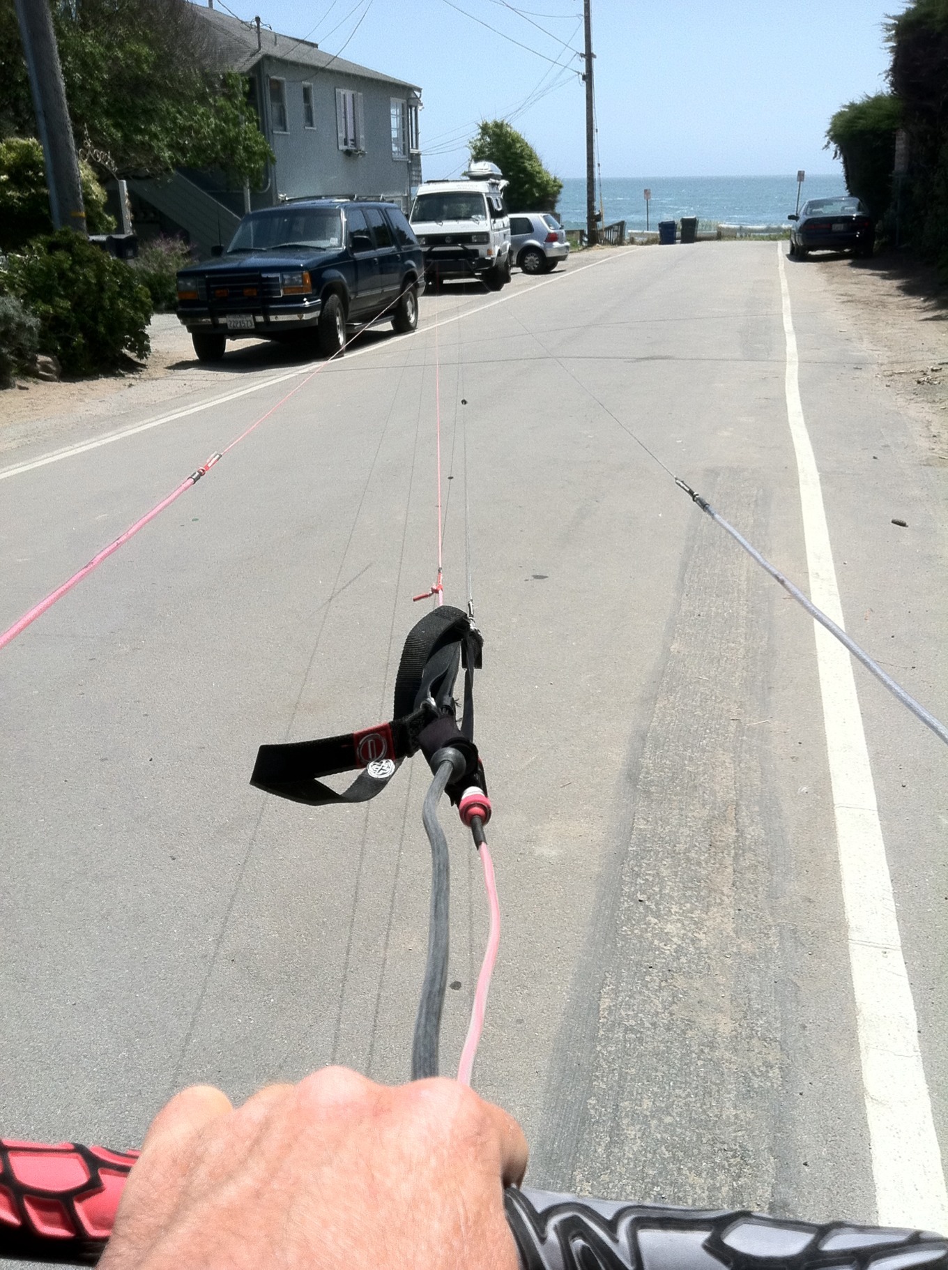 Below is a closeup if the front lines where they meet the trim strap. The left (red) line attaches to a fixed pigtail on the strap. The black line goes through a ring on the strap and attaches to another ring on the end of the safety line so the bar can run up the line when the chickenloop is released.